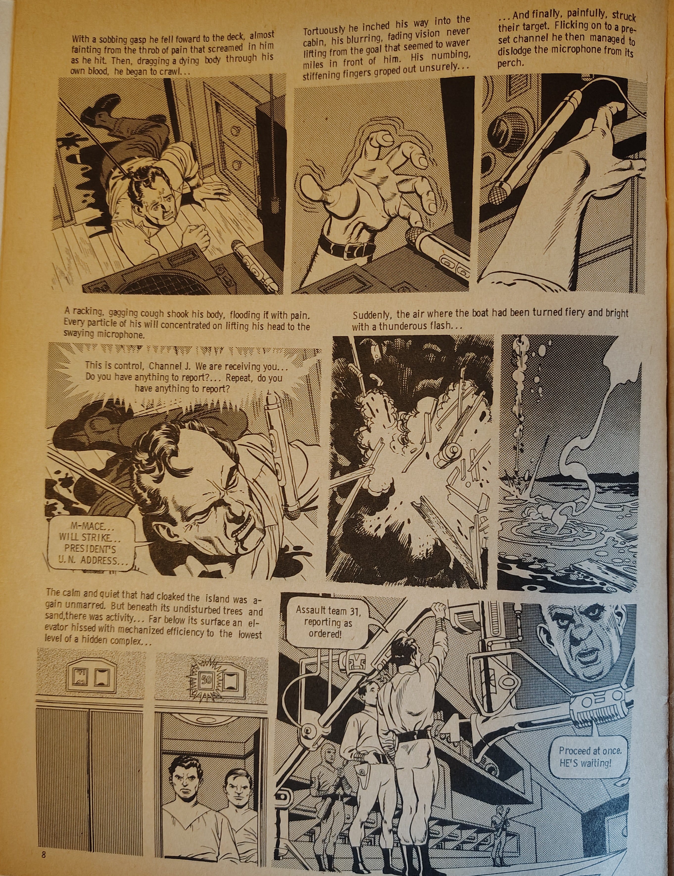 I included a few pages of the comic book here so you can see for yourself. The cartoonists here will notice how the typed captions underneath each panel slow down what should be a swift-paced opening scene. The captions describe what you can see for yourself.